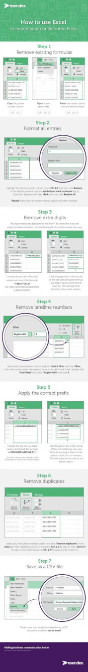 Does your customer database have telephone numbers entered with different formatting? Perhaps some with the +61 country code, some with (0) and some starting with 614. Or do you have mobile phone numbers ending up in the columns for home or office numbers, or vice versa? If you are nodding your head, we extend our sympathies and warmly welcome you to the club! We know the pain of having to work with an uneven data set, hence we’ve created this infographic to guide you, step by step, on how to clean and reformat telephone numbers in Excel so that you can have a telephone list that is accurately and consistently formatted. And even though we create this with our Echo users in mind, it’s useful for any application or platform that needs consistency, so share with anyone who may have the same challenge!