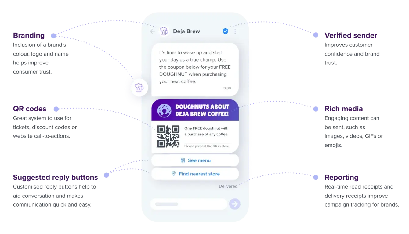 RCS gives you more than just text. From branding and rich media to instant reply buttons and verified sender details, every message is designed to create a more engaging and trusted customer experience.