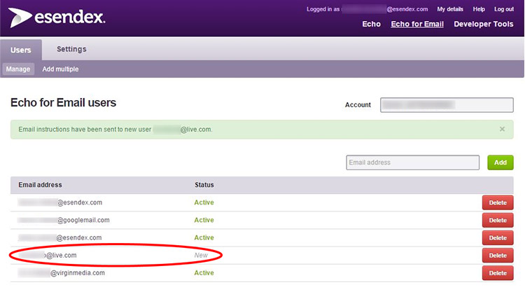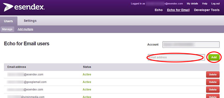 On this page, you will see a list of email addresses that can be used as part of Echo Email, in addition to adding new ones. To add a new address, simply type the full address into the text box provided and click “add.”